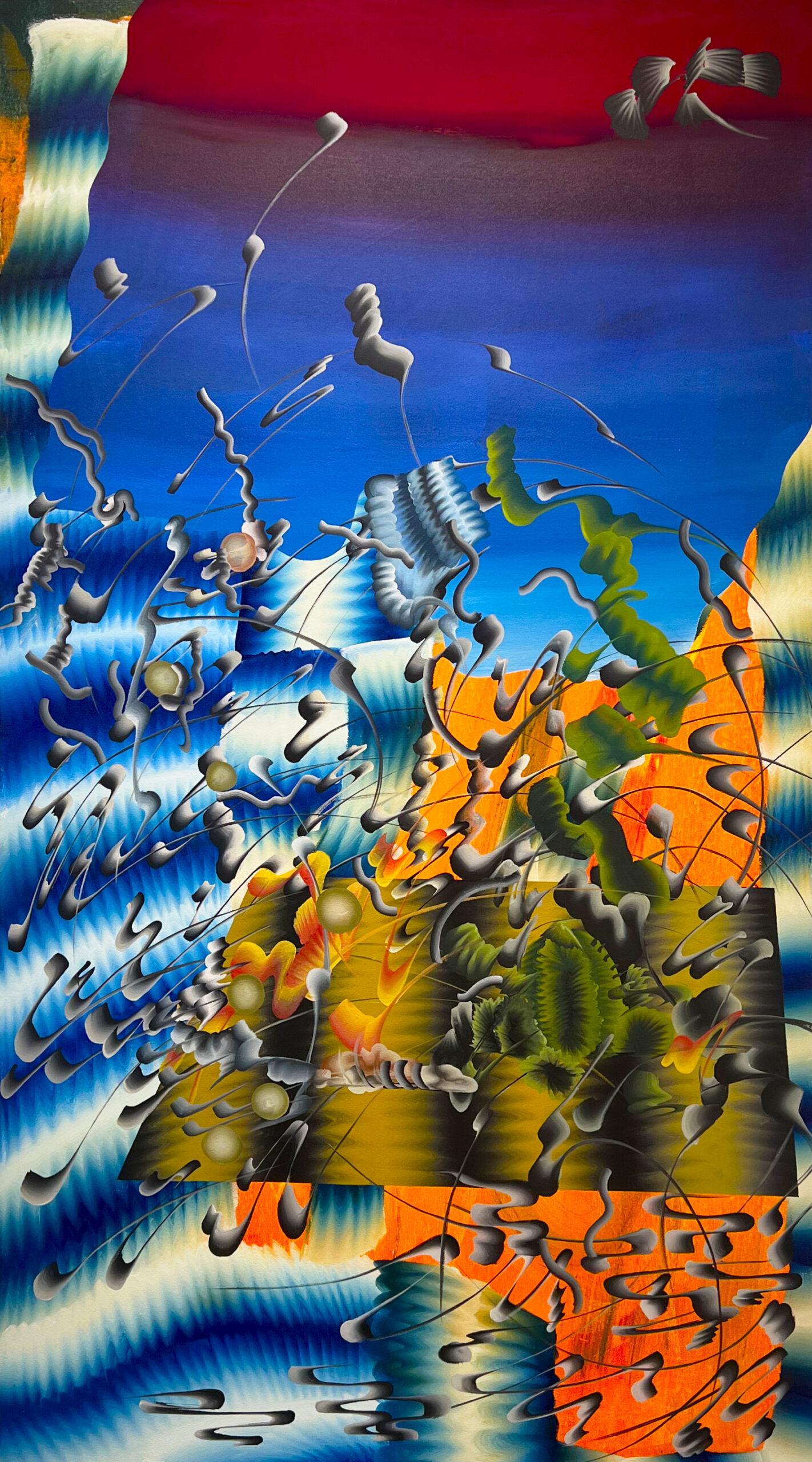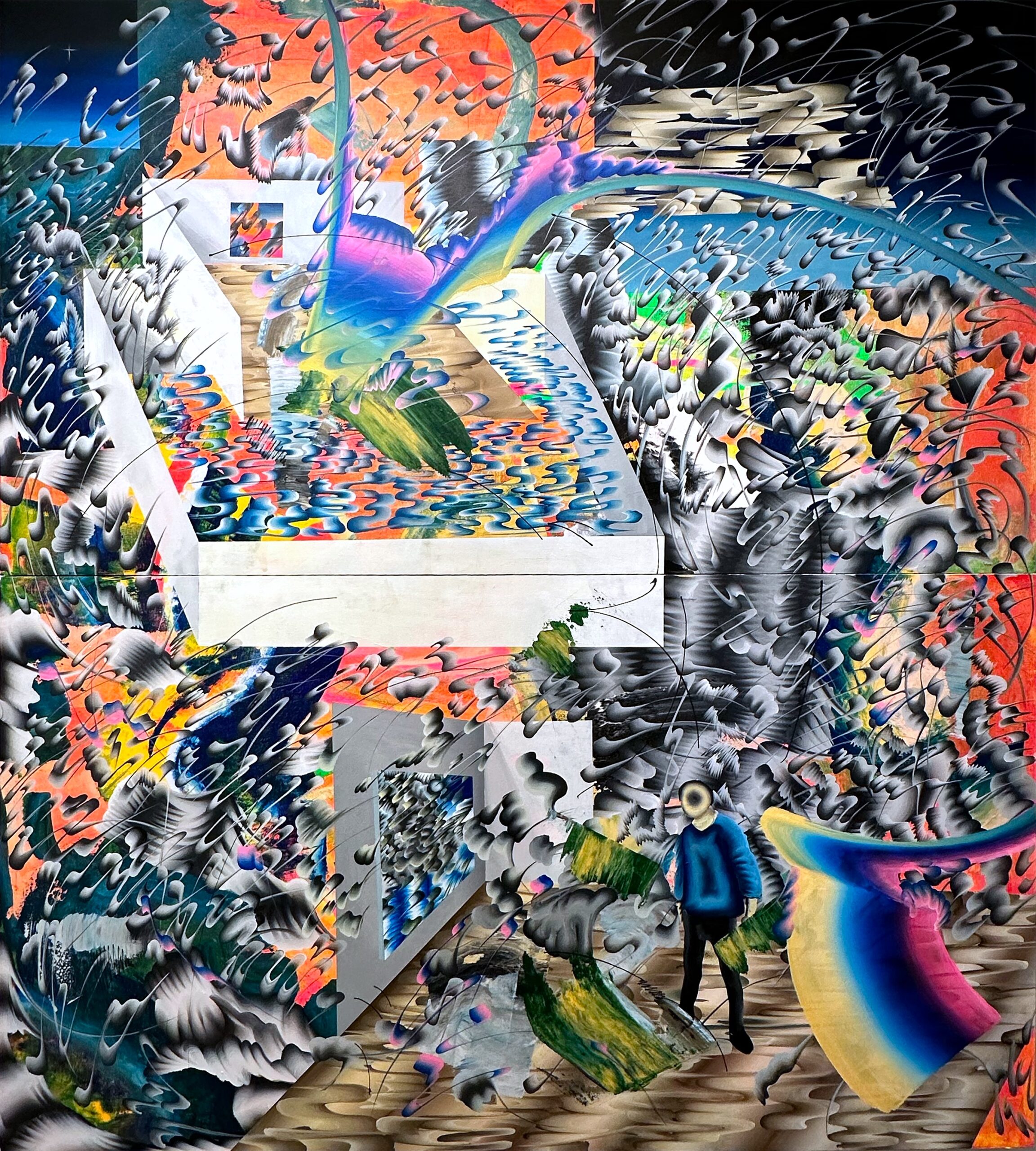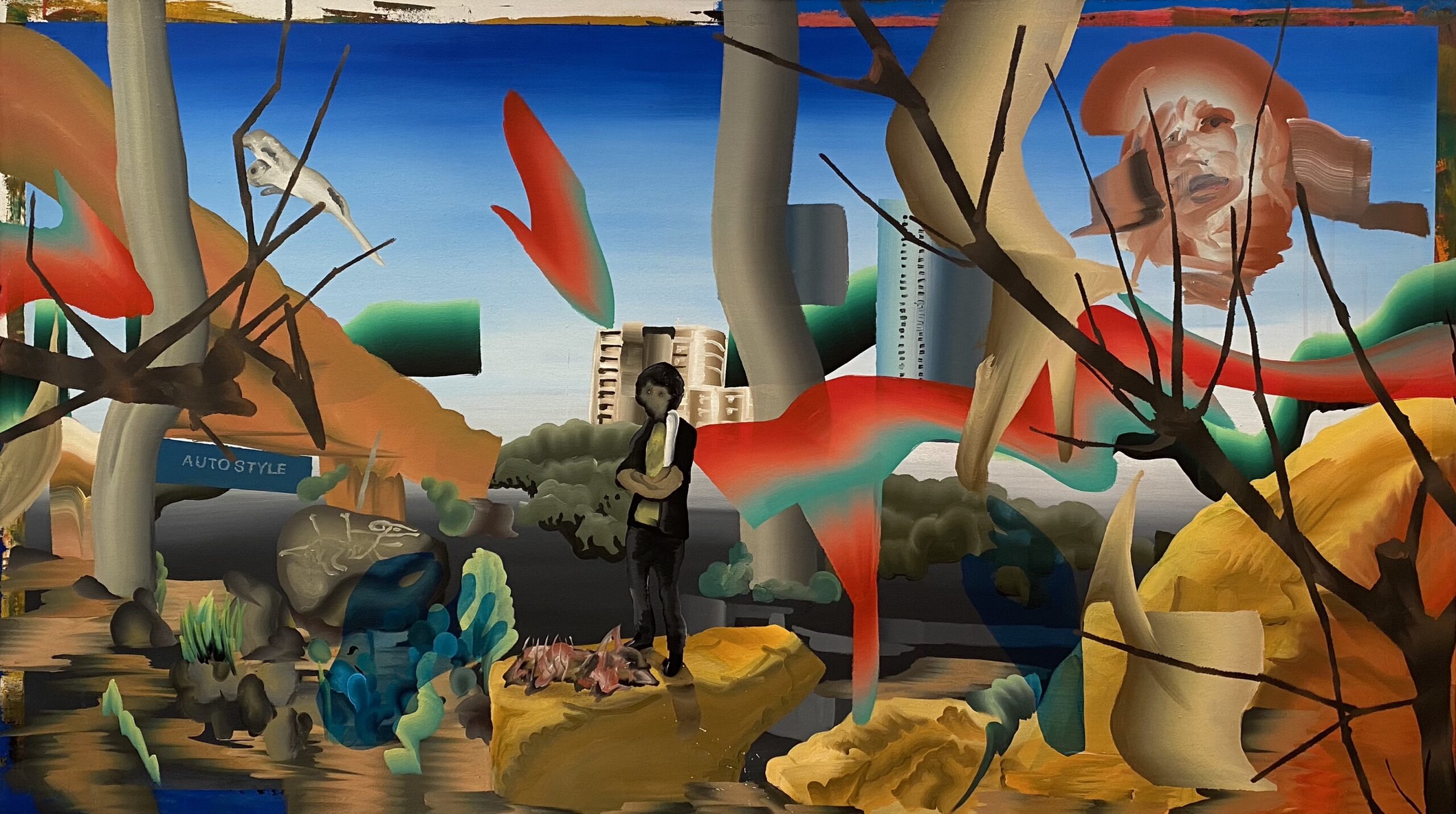 デジタルネイティブ世代として、"インターネット以後の世界において、風景とは何か"という問いに常に関心を寄せ、探究し続けている。作品は、SNSやスマートフォン、ゲーム、Googleマップなど現代のデジタル⽂化に着想を得ており、Photoshop的な筆致や「16:9」の画⾯⽐率を取り⼊れた構図が特徴である。