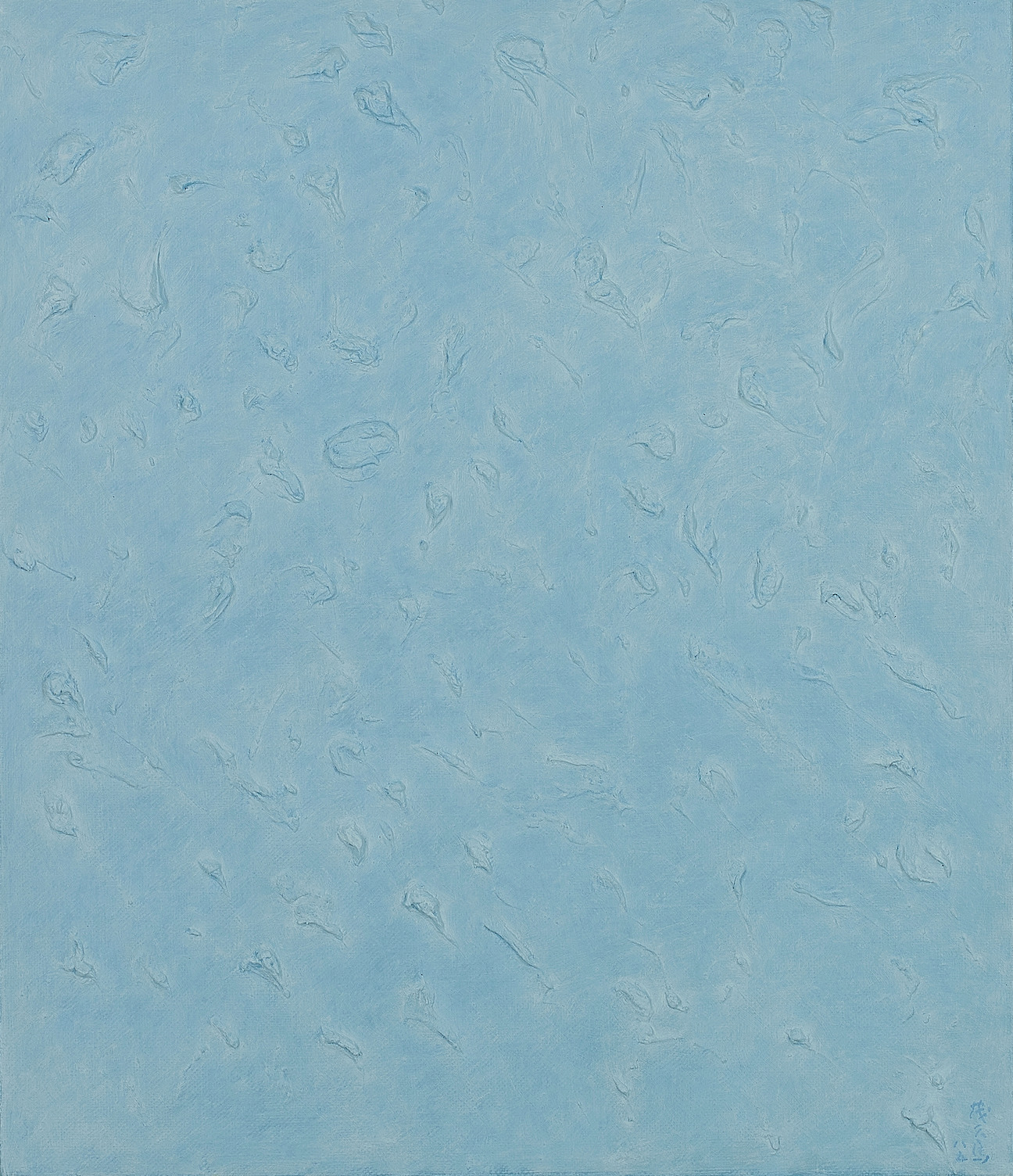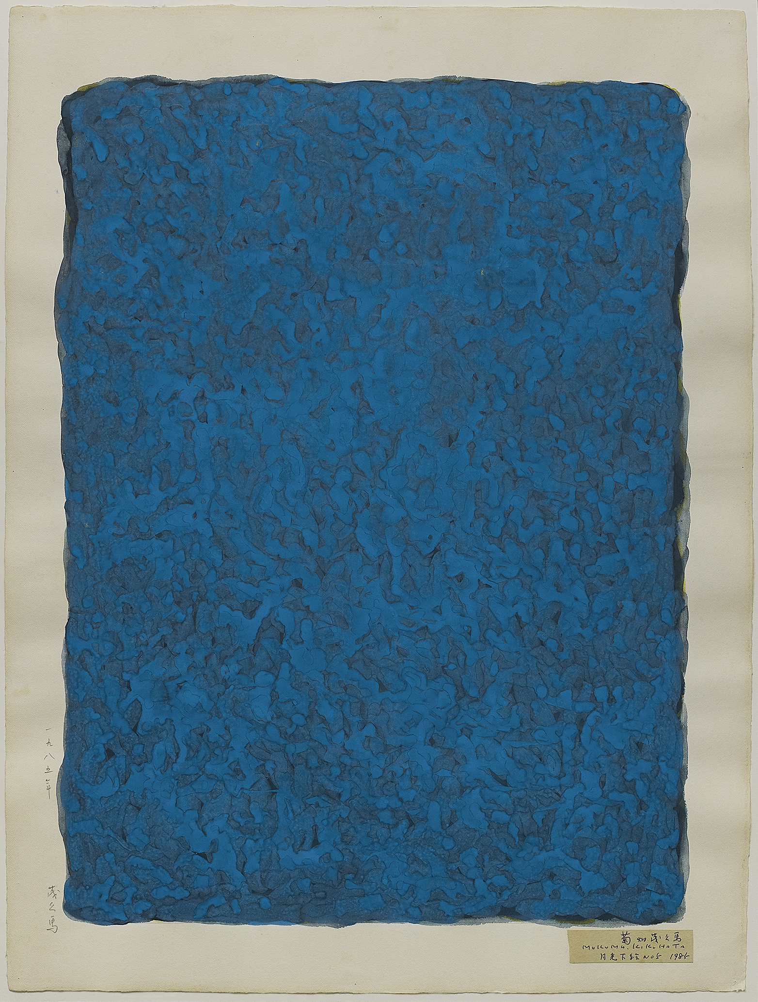 この1986-1988に発表された《月光》シリーズはさなざまなblueを基調とした色面の奥に菊畑が生み出すゴツゴツとした月面をも思わせる物体が潜んでいます。